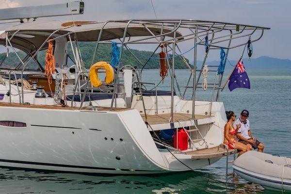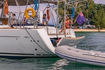 Designed for serious blue-water cruising, Si Spirit is CE Category A (Ocean) certified for up to 12 people and is equipped with additional fuel and water capacity for extended passages. Her original sugar-scoop sterns have been upgraded to a smart electric dinghy garage that also serves as a generous swim platform, providing safe and effortless access to the water.