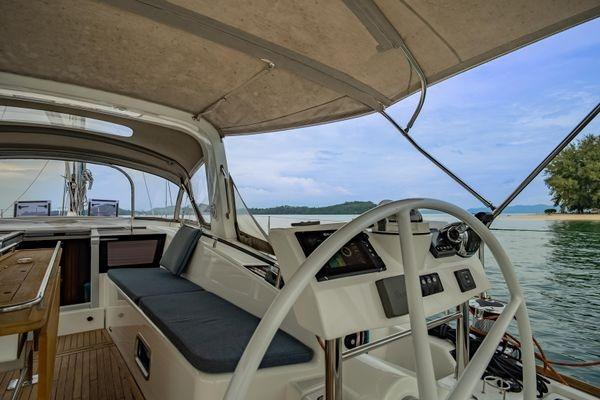 The cockpit is exceptionally spacious and thoughtfully laid out, featuring a large folding table and a clean, uncluttered design. A fibreglass arch supports the bimini and substantial dodger with clears, offering excellent protection. At anchor, the electric swim platform lowers at the touch of a button, making boarding the dinghy or swimming simple and safe.
