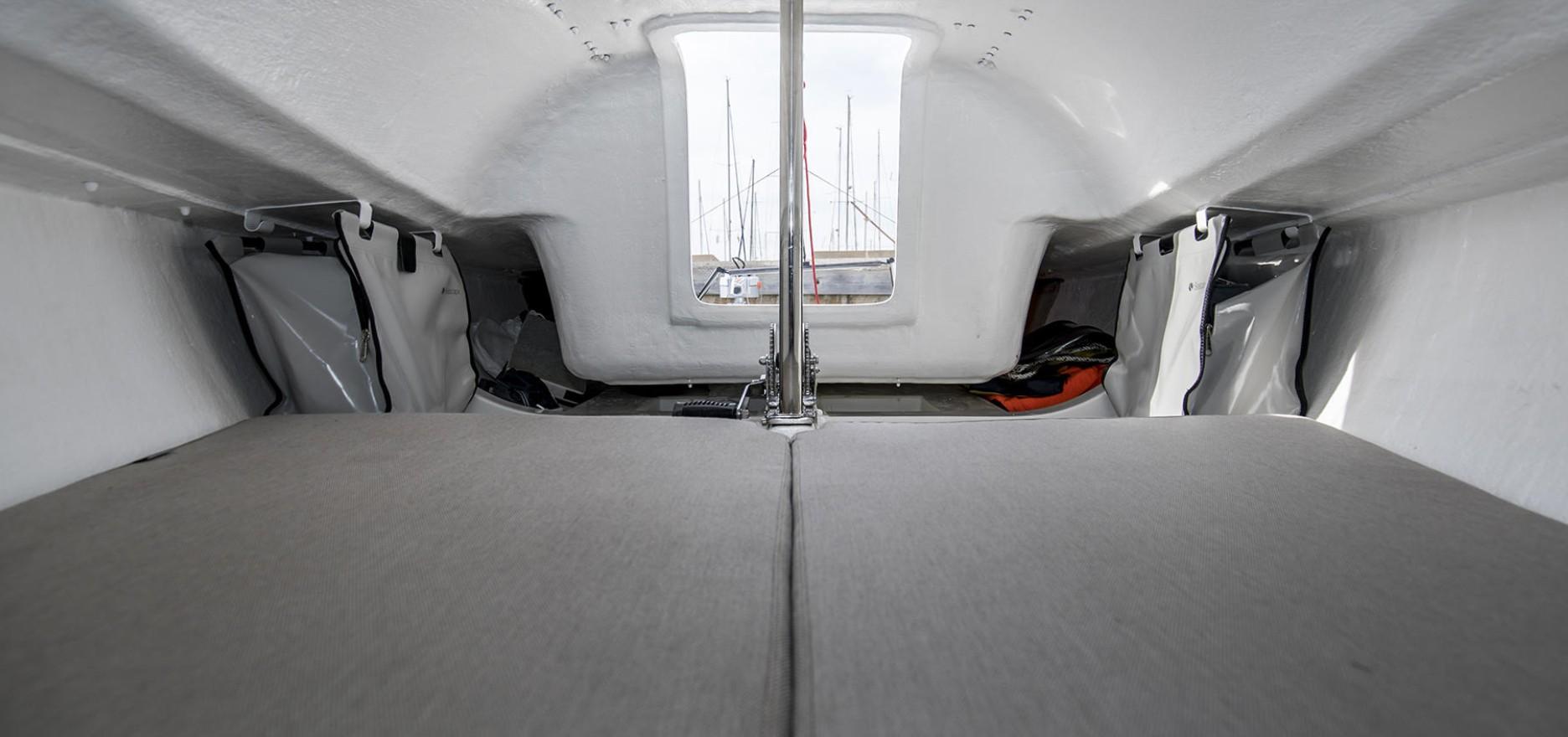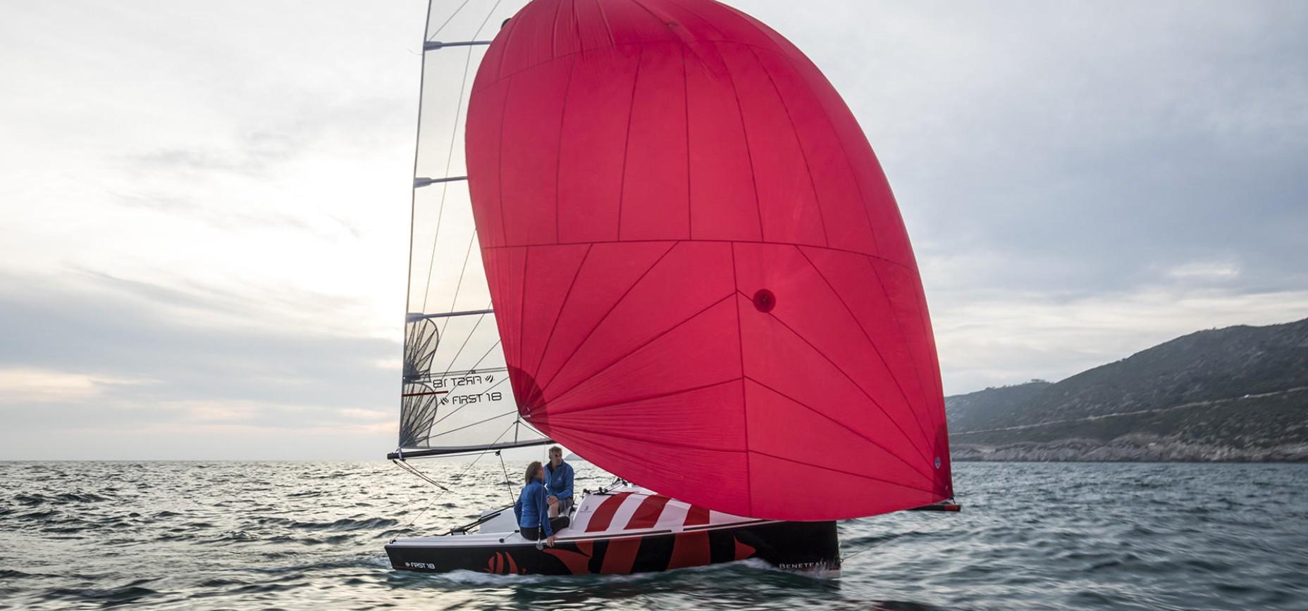 A large progressively chined hull gives you a taste of what is to come. The First 18 offers speed and sensations, whatever your programme. Stable and lightweight, with a planning hull and high-performance rigging, the First 18 makes the most of the slightest puff of wind to reach speeds that can equal it! Stiff in a breeze, she is also perfectly at ease when the wind picks up. Certified for four people aboard, the First 18 handles easily with a crew of two or solo, even under spinnaker. Thanks to her lifting keel, you can beach wherever you want.