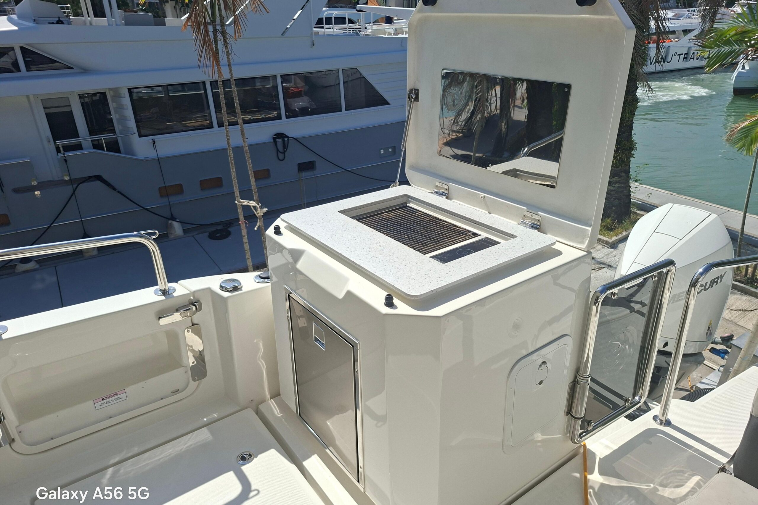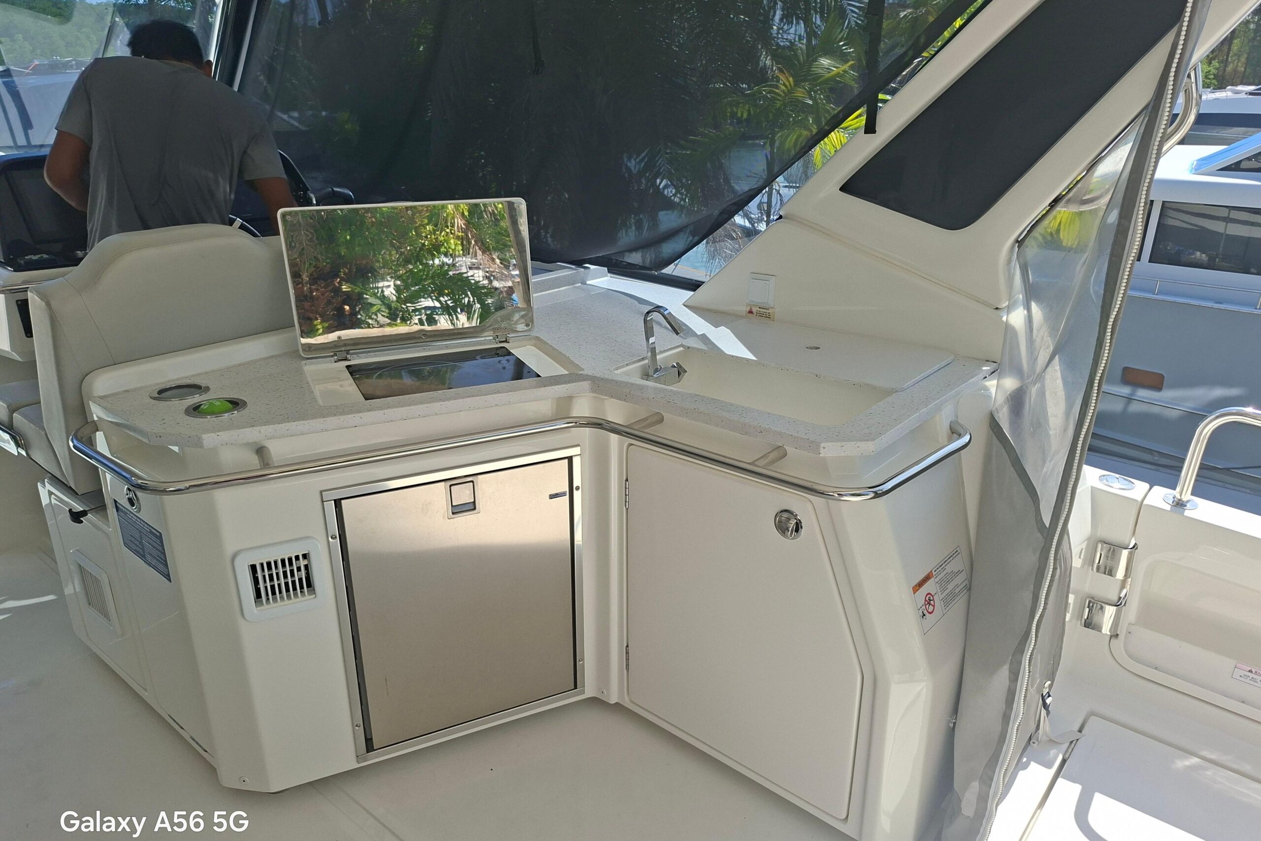 An electric cockpit BBQ and additional stainless steel refrigeration elevate this yacht into a true floating entertainment platform.