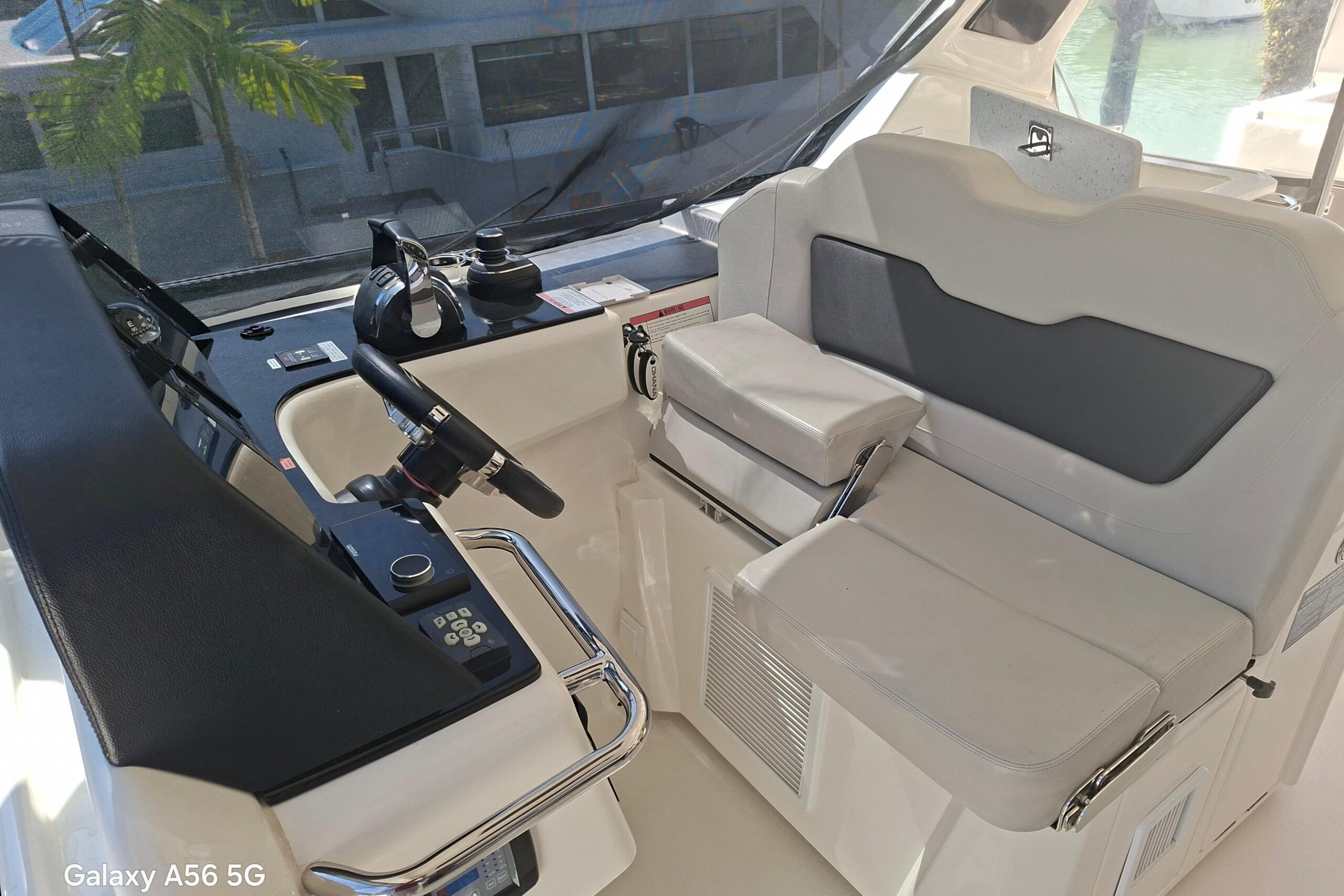 Refined Helm & Navigation SuiteThe helm is fully equipped for serious cruising, featuring a premium Raymarine offshore navigation package with dual 12” Axiom Pro displays, upgraded 24” HD radar, AIS, CHIRP sonar, VHF, and additional GPS antenna. This is a commanding, confidence-inspiring helm station designed for both seasoned owners and owner-operators.